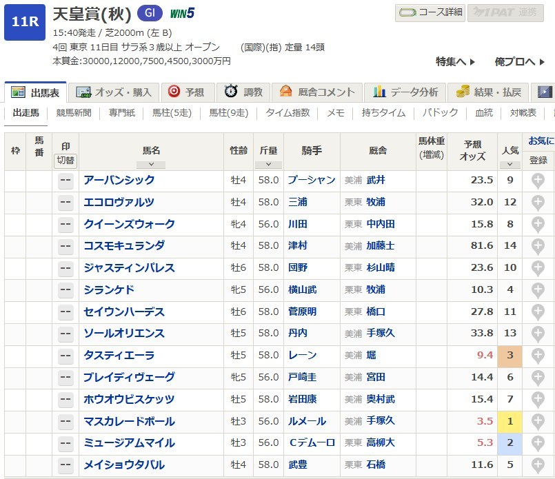 【天皇賞秋2025データ分析】東京芝2000mで行われるGⅠ天皇賞秋!今年は3歳のマスカレードボール、ミュージアムマイルが人気になりそうだが当然大穴狙い!週末は雨?重馬場適正は?データでは大外枠不利?年齢・馬体重・騎手・血統・前走ローテ・脚質・上がり3F最速は?穴馬候補はメイショウタバル、ジャスティンパレス、ソールオリエンス!