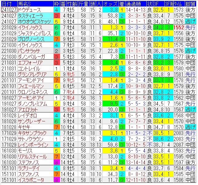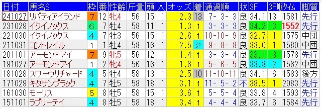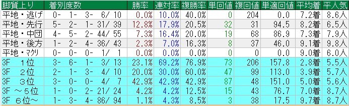 脚質パターンは・・・「差し→先行(逃げ)」「先行→差し」「差し→差し」。上がりは良馬場なら33秒台。馬場が良ければ32秒台もある。時計は1分57秒台。展開次第で56秒台もありそう。瞬発力必須!しかしこうやって見るとやはりヒモは結構荒れてるねえ。