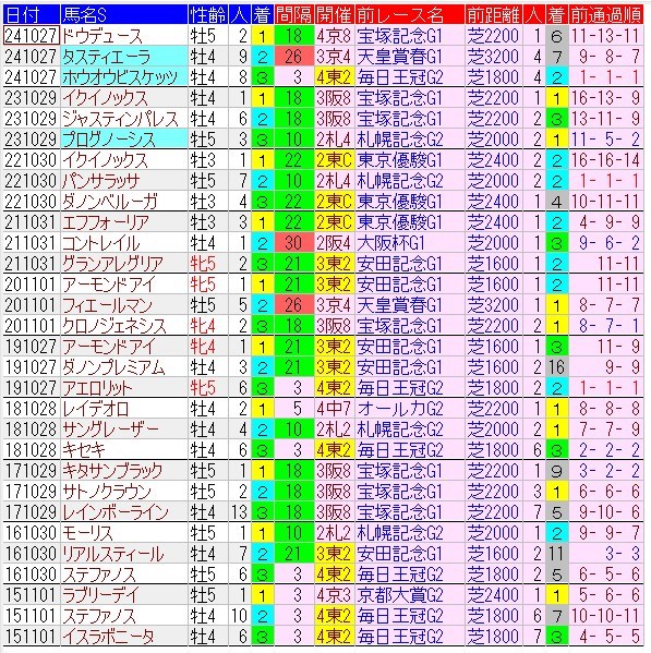 注目ローテは・・・宝塚記念(7頭)、毎日王冠(5頭)、安田記念(5頭)、札幌記念(4頭)、ダービー(3頭)。前走は全てGⅠ~GⅡ。例外なし。前走距離は1600~2400m。前走GⅠなら着順不問。GⅡなら好走条件とする。