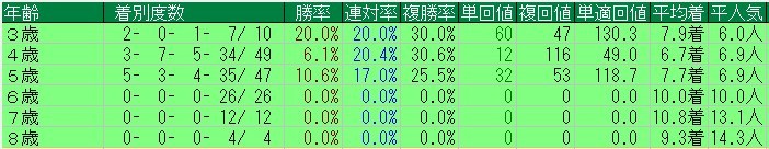 3歳がめちゃくちゃ強いかと思ったがそうでもないねー。4歳、5歳が中心。6歳以上は馬券例なし。