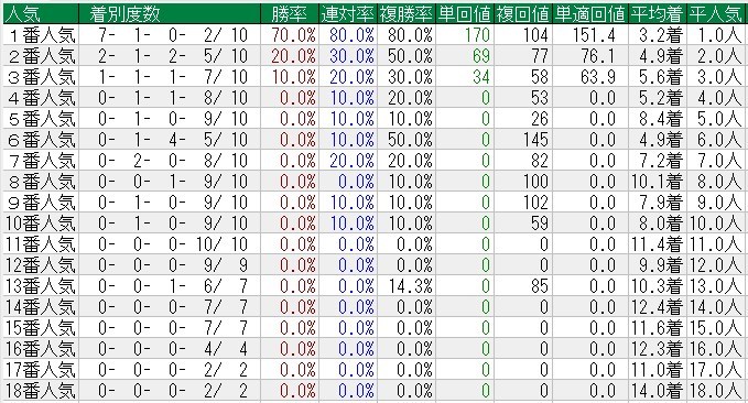 なんじゃこりゃー!1番人気がべらぼーに強い!2番人気もまあ強く・・・1着は全て3着以内というガチガチレース!ただし!ヒモ荒れはそこそこ期待出来るレースでね。2~3着は穴狙いも可能!しかし二桁人気の大穴は過去10年で2頭のみ・・・大穴狙いはヤメといた方がいいかもね。