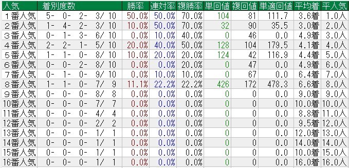 ぐえ!1番人気強いなー。さらに2番人気も強いやんかー。少頭数で行われることが多いレースとはいえ、馬券の8割以上が5番人気以内。8番人気の馬が一度勝ってるので荒れないというわけではないが、基本的に本命党向けのレースですな。