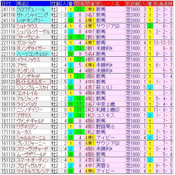 注目ローテは・・・新馬(15頭)、未勝利(4頭)。重賞は3頭、オープン特別は8頭。新馬戦で素質を示した馬が強く、馬券の半数を占める。何よりポテンシャルが重要なレースだ。激アツなのは6月の新馬戦を勝ち上がって今回が2戦目というタイプ。未勝利からも馬券に来ないことはないが劣勢。構図としては、新馬組vsオープン特別組という感じか。前走距離はほとんどが1800~2000m。マイルからもたまに来るが、これは劣勢。前走着順は1着限定。オープン特別のみ2着以内。例外はシュトラウスのみ。
